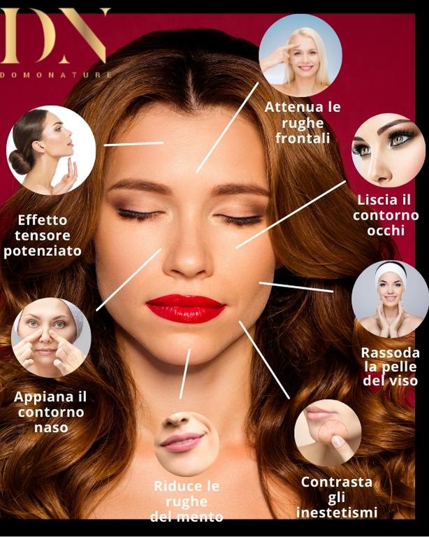Il siero Domonature svolge un'azione a 360° su tutto il viso, contrastando le imperfezioni più fastidiose come rughe, zampe di gallina o rughe di espressione.